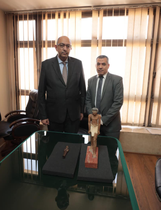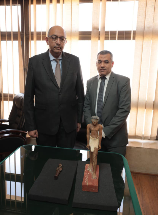 القطعتان اللتان تم تسليمهما اليوم عبارة عن تمثال من الخشب الملون لرجل واقف يرتكز على قاعدة يعود لعصر الدولة القديمة؛ وتمثال آخر صغير من "الأوشابتي" المصنوع من الخشب من العصر المتأخر.
