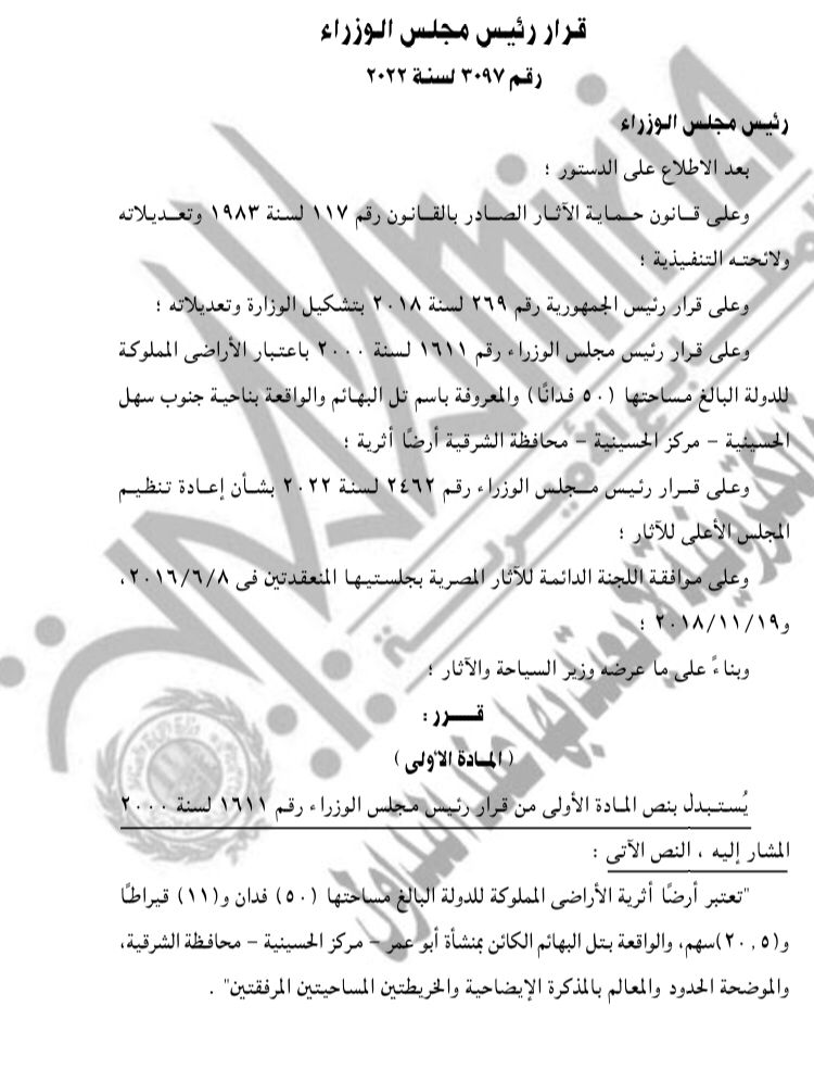 وعلى قرار رئيس الجمهورية رقم ٢٦٩ لسنة ٢٠١٨ بتشكيل الوزارة وتعديلاته ؛وعلى قرار رئيس مجلس الوزراء رقم 1611 لسنة ٢٠٠٠ باعتبار الأراضي المملوكة ساحتها (50 فدانًا ) والمعروفة باسم تل البهائم والواقعة بناحية جنوب سهل محافظة الشرقية أرضا أثرية ؛ للدولة البالغ مساء بينية – مركز الحسين