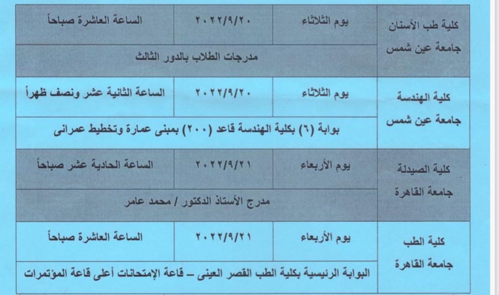 الساعة العاشرة صباحا في قاعة الامتحانات أعلى قاعة المؤتمرات البوابة الرئيسية بكلية الطب القصر العيني.