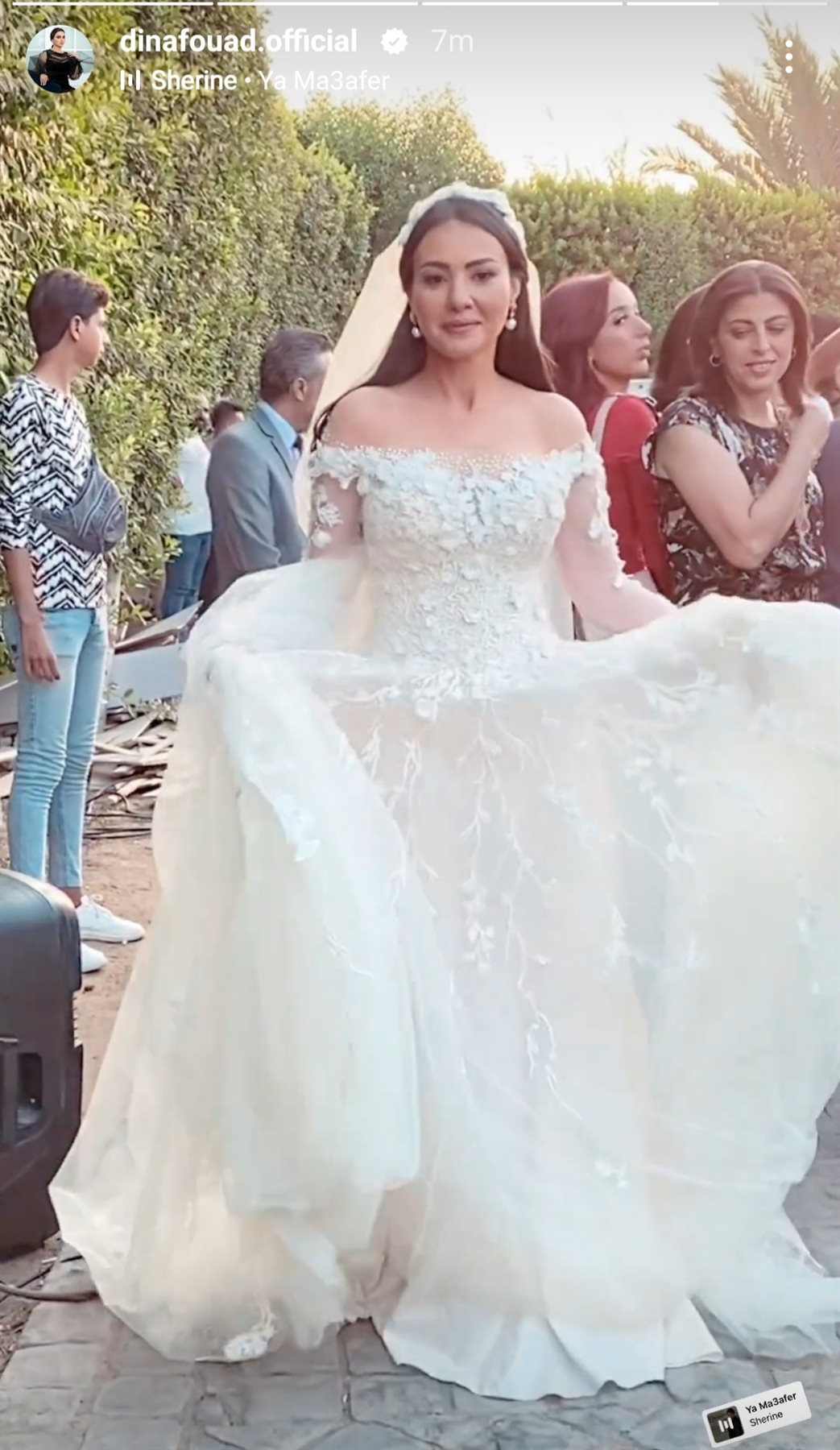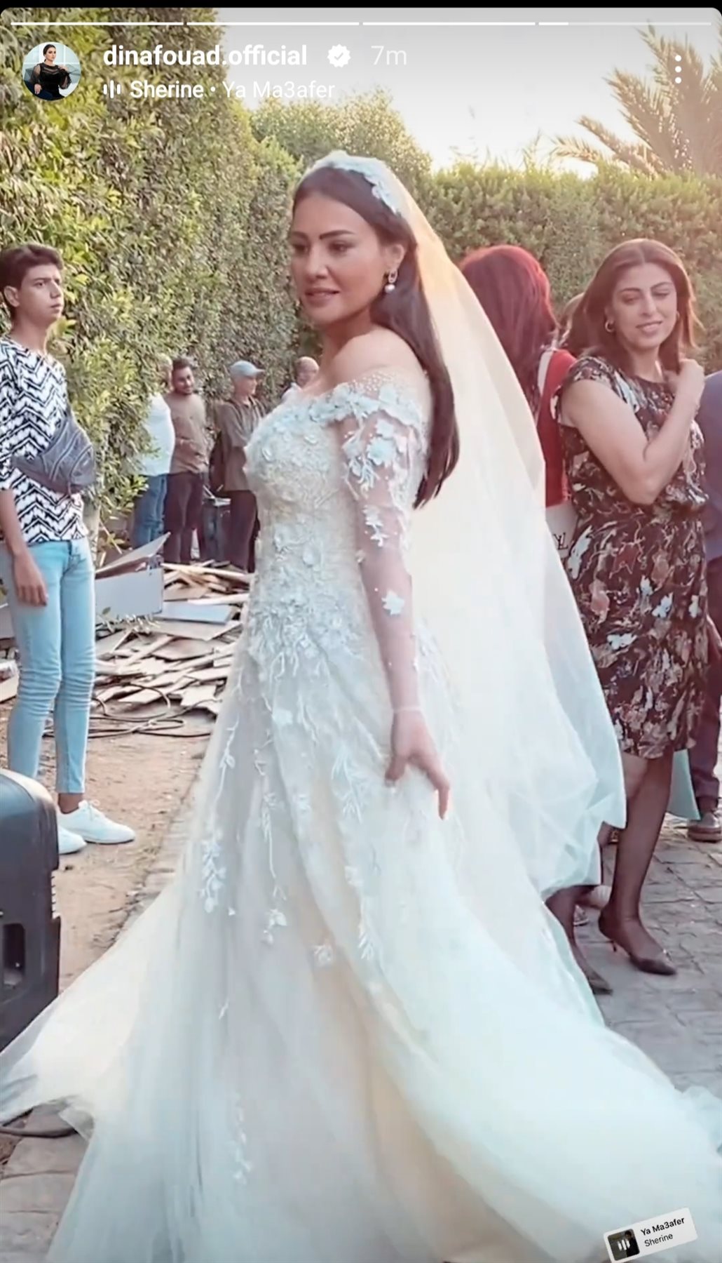 وظهرت دينا فؤاد في الفيديو مرتدية فستان فرح، وذلك من كواليس أحد أعمالها.