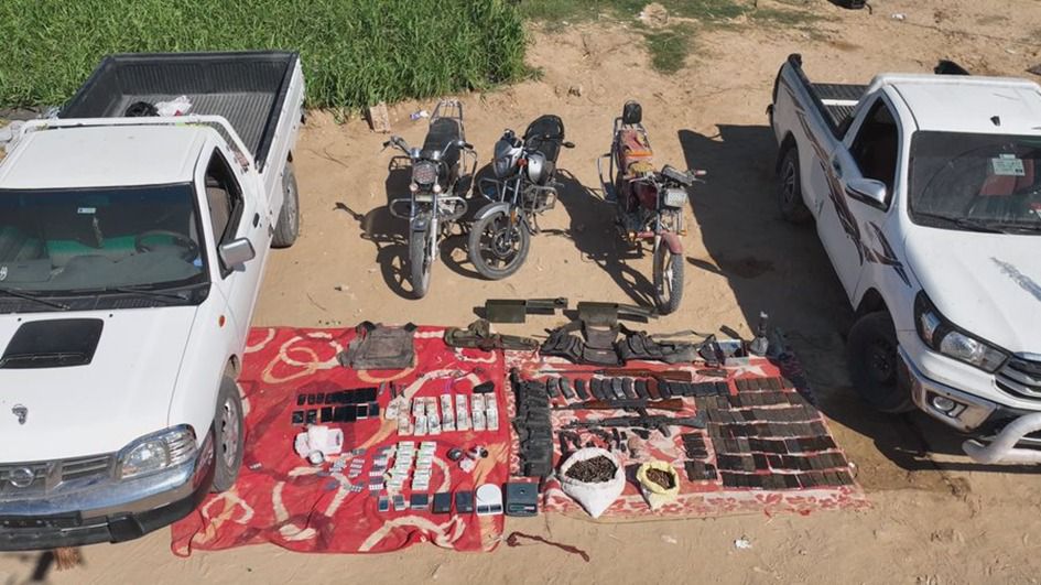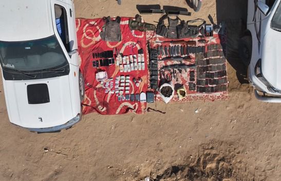 وأسفرت أعمال التفتيش عن ضبط (70) طربة لمخدر الحشيش وكذا كمية مجزئة وزنت جميعاً 10 كيلو جرام وكمية لمخدر الآيس "الشابو" وزنت واحد كليو جرام وكمية لمخدر الأفيون وزنت نصف كيلو جرام وكمية لمخدر الهيروين وعدد من الأقراص المخدر والمؤثر على الحالة النفسية و (2) بندقية آلية و (2) فرد محلى وبندقية رش وطبنجة و (15) خزينة متنوعة وعدد من الطلقات النارية مختلفة الأعيرة و (2) سيارة "بدون لوحات معدنية" و (3) دراجات نارية "بدون لوحات معدنية" و (8) سلاح أبيض و (5) ميزان حساس ومبلغ مالى، و (5) هواتف محمولة.