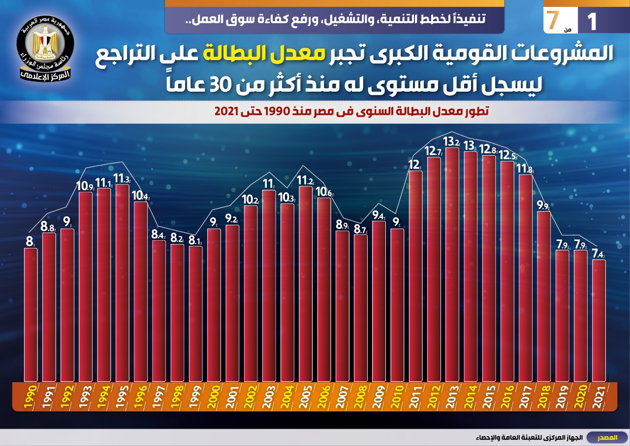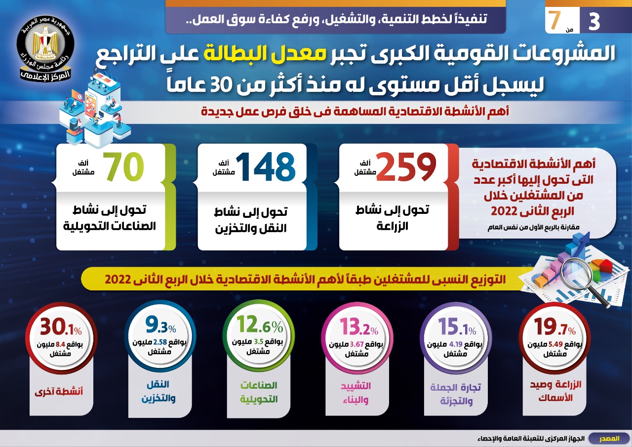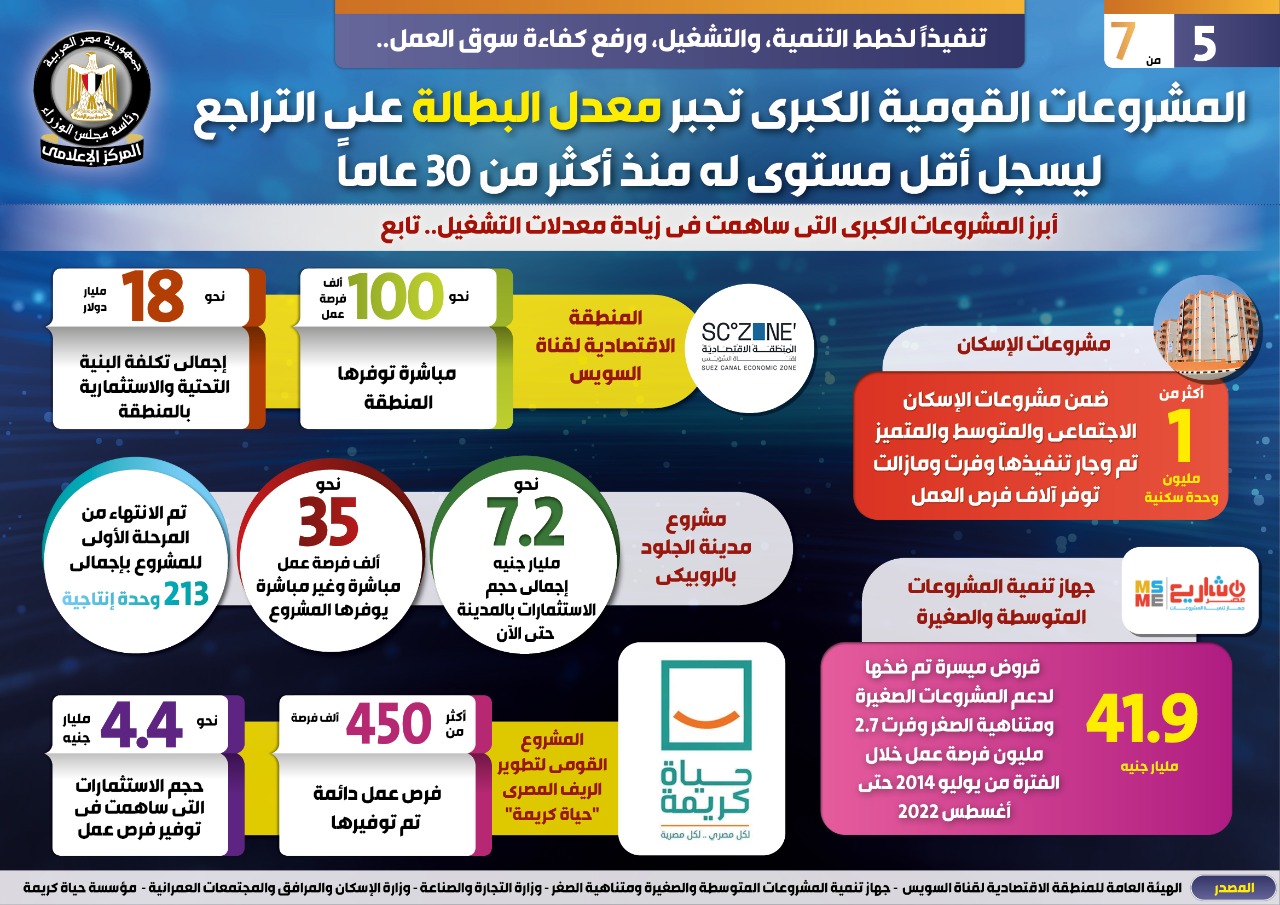 وفي هذا الصدد نشر المركز الإعلامي لمجلس الوزراء تقريراً تضمن إنفوجرافات تحت عنوان "المشروعات القومية الكبرى تجبر معدل البطالة على التراجع ليسجل أقل مستوى له منذ أكثر من ٣٠ عاماً " وذلك تنفيذاً لخطط التنمية، والتشغيل، ورفع كفاءة سوق العمل.