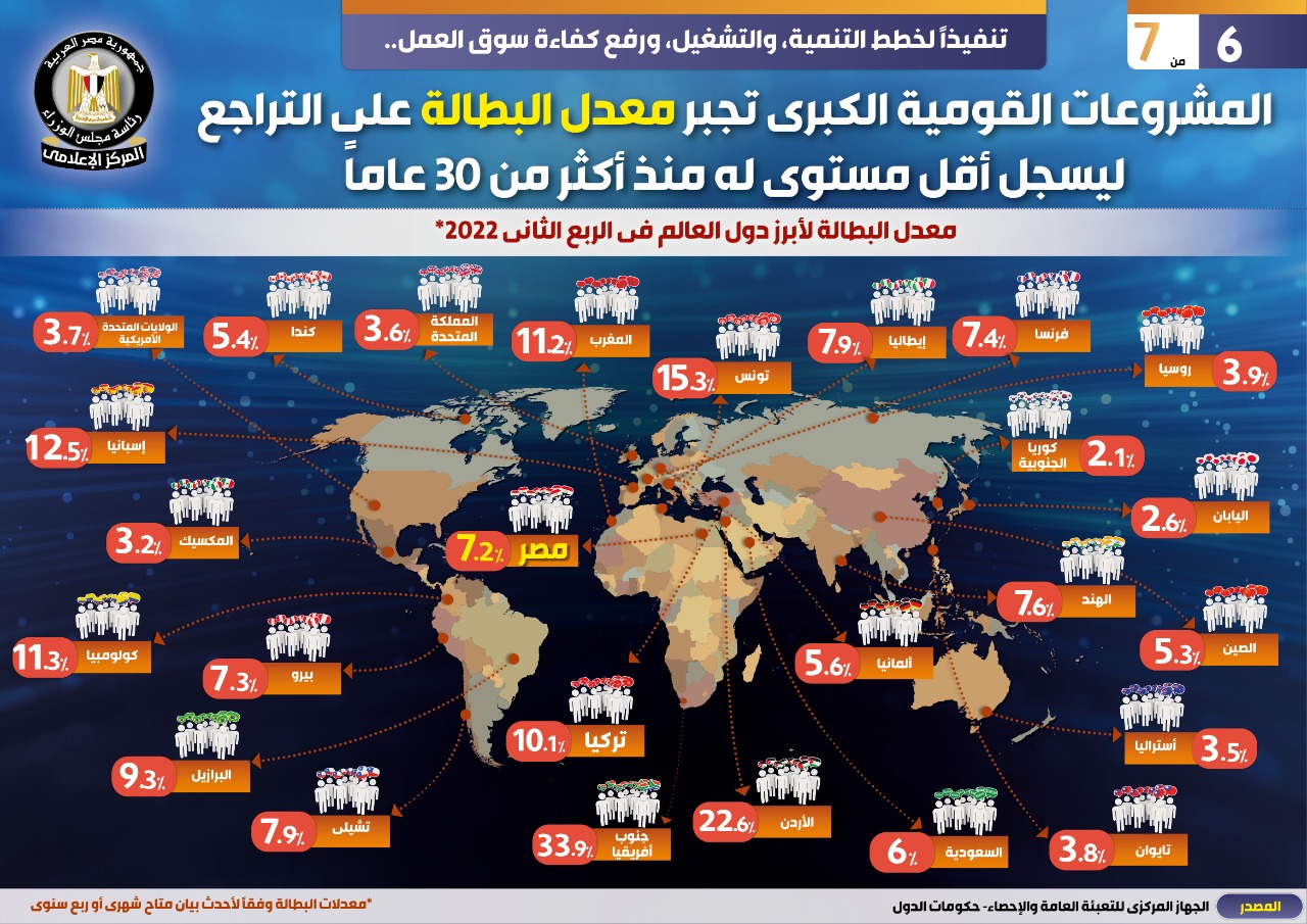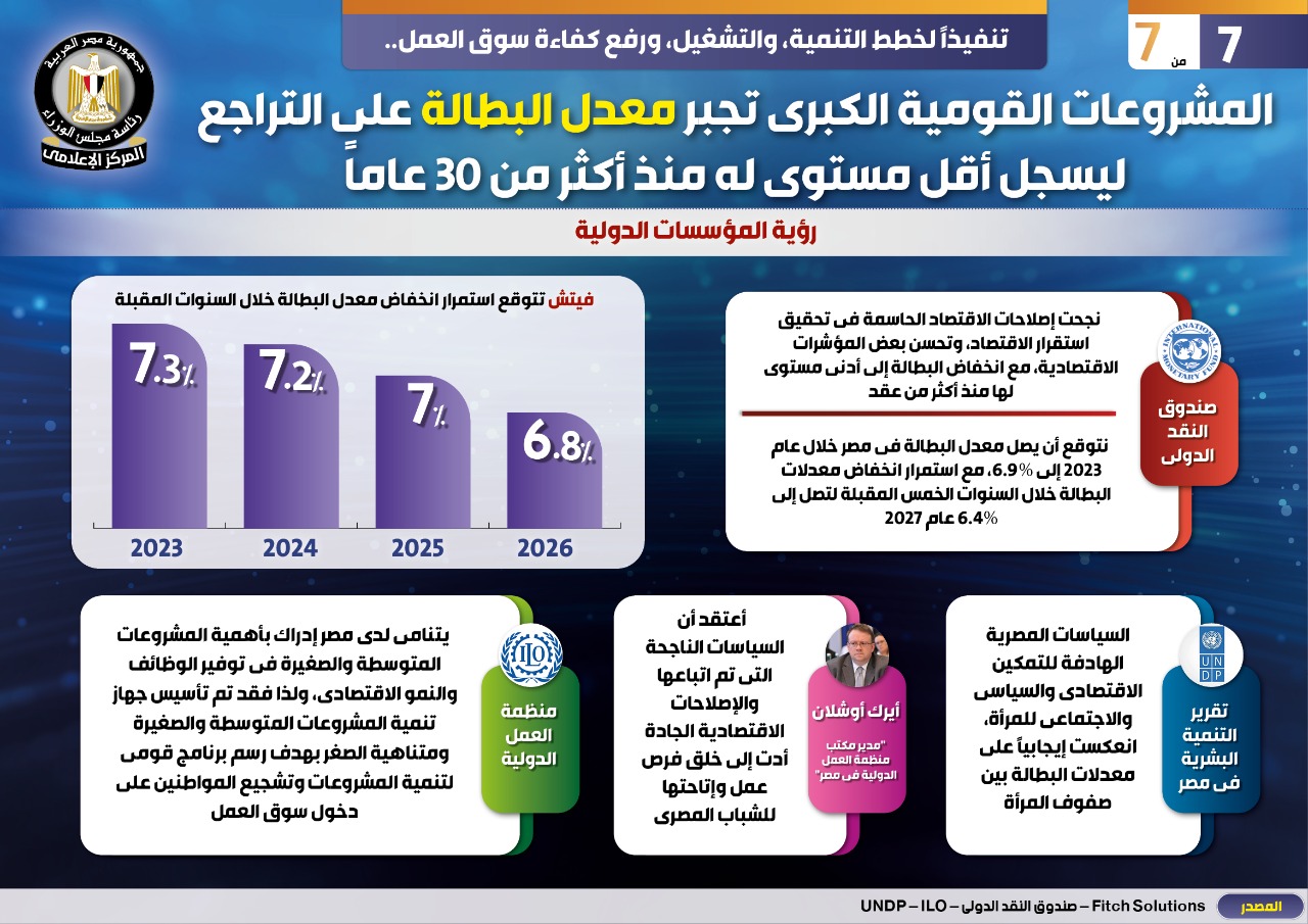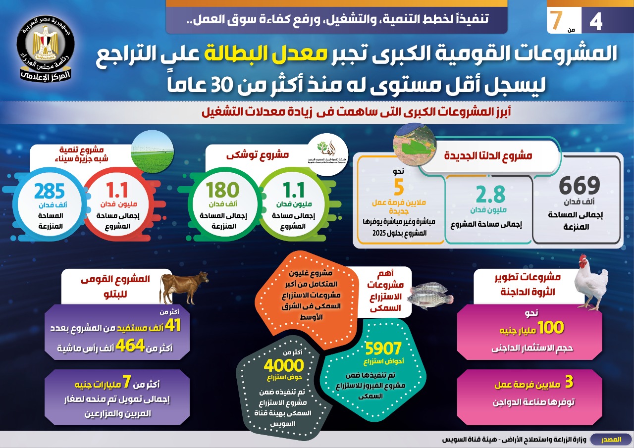 وفي هذا الصدد نشر المركز الإعلامي لمجلس الوزراء تقريراً تضمن إنفوجرافات تحت عنوان "المشروعات القومية الكبرى تجبر معدل البطالة على التراجع ليسجل أقل مستوى له منذ أكثر من ٣٠ عاماً " وذلك تنفيذاً لخطط التنمية، والتشغيل، ورفع كفاءة سوق العمل.