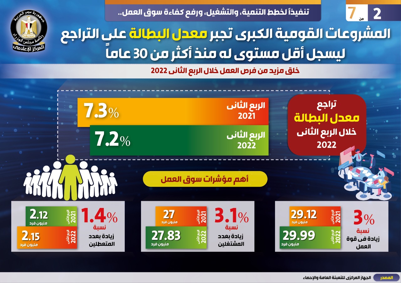 ورصد التقرير مؤشرات زيادة فرص العمل خلال الربع الثاني من عام 2022، مشيراً إلى أن من أهم المؤشرات تراجع معدل البطالة خلال هذا الربع مسجلاً 7.2% مقابل 7.3 % في الربع الثاني من عام 2021.