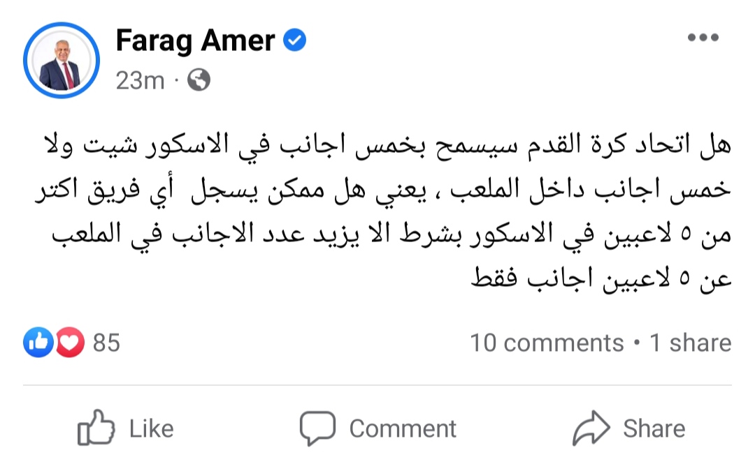 وكتب: "هل اتحاد كرة القدم سيسمح بخمس أجانب في السكور شيت ولا خمس أجانب داخل الملعب، يعني هل ممكن يسجل أي فريق أكثر من ٥ لاعبين في الاسكور بشرط ألا يزيد عدد الأجانب في الملعب عن ٥ لاعبين أجانب فقط".