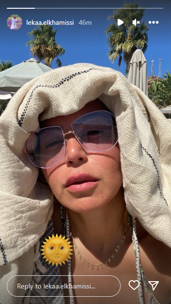 وظهرت لقاء الخميسي في صورة سيلفي أسفل أشعة الشمس، مرتدية نظارة شمس، وواضعة وشاحا على رأسها.