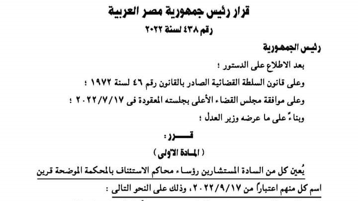 ننشر قرار رئيس الجمهورية رقم 438 لسنة 2022 وذلك بعد الاطلاع على قانون السلطة القضائية الصادر بالقانون رقم 46 لسنة1972 وعلى موافقة مجلس القضاء الأعلى وبناء على ما عرضه وزير العدل