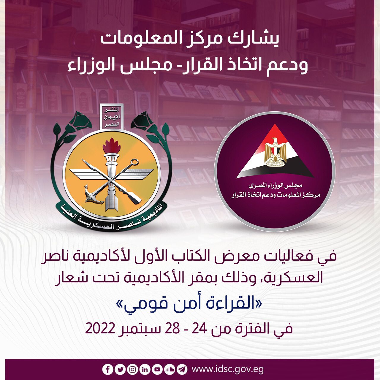 يُشارك مركز المعلومات ودعم اتخاذ القرار التابع لمجلس الوزراء بالمعرض الأول للكتاب الذي تُنظمه أكاديمية ناصر العسكرية العليا وذلك بمقر الأكاديمية في الفترة من ٢٤ - ٢٨ سبتمبر لهذا العام.