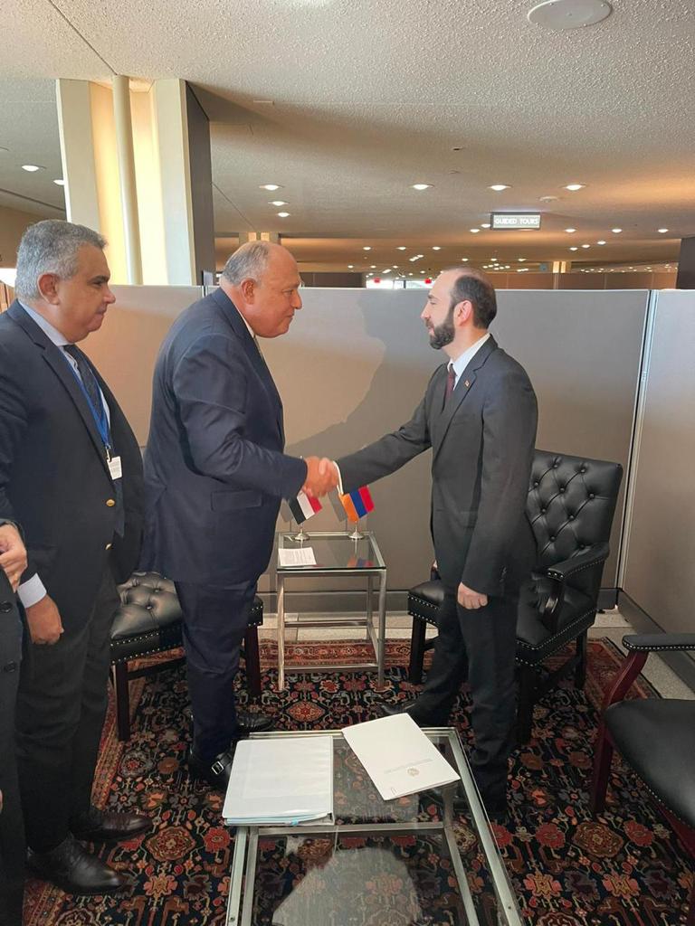 استمرارا للقاءاته على هامش أعمال الدورة 77 للجمعية العامة للأمم المتحدة، التقى وزير الخارجية سامح شكري، الجمعة، مع وزير خارجية أرمينيا "آرارات ميرزويان".