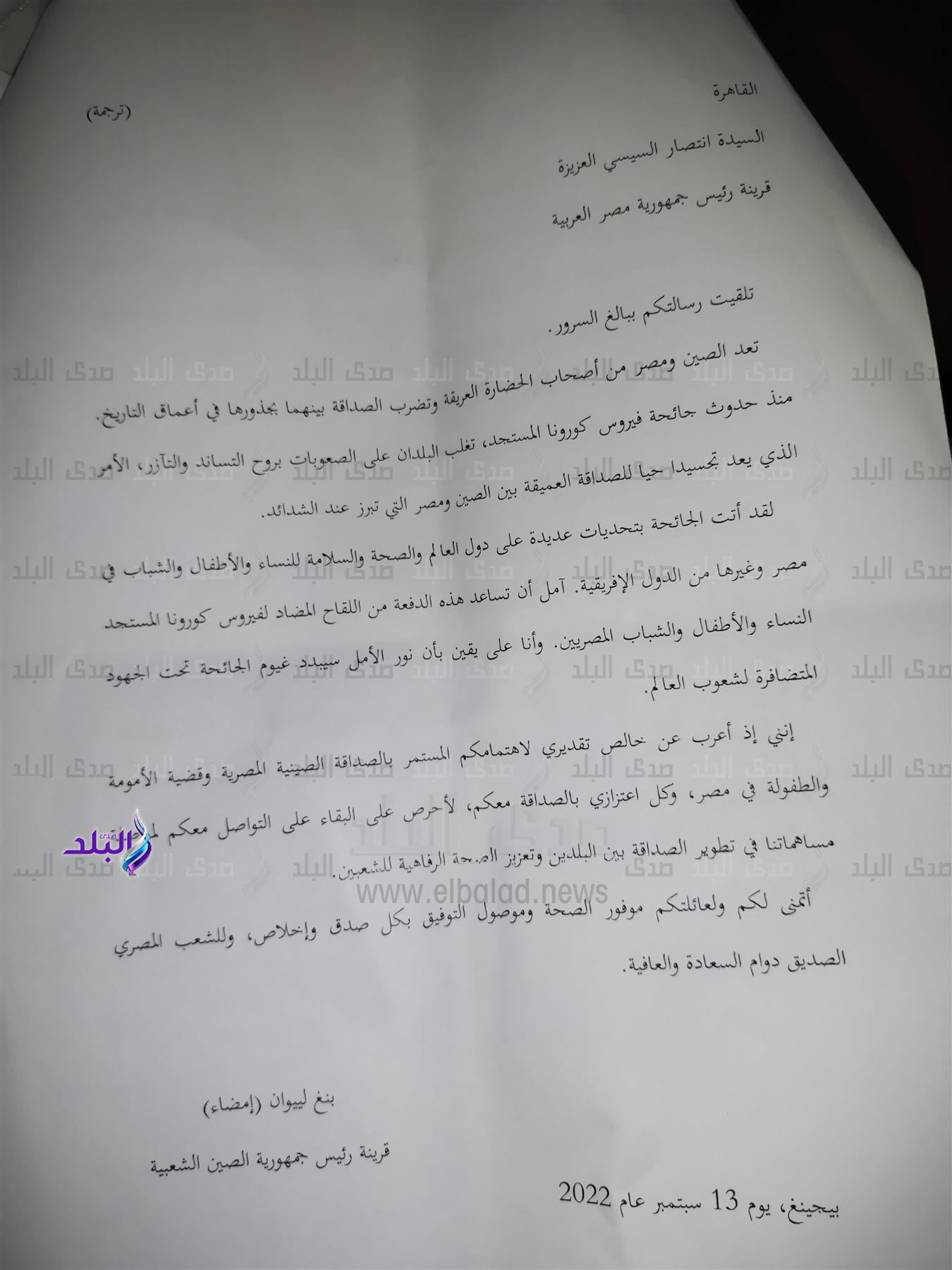 واستعرض القائم بأعمال السفير الصيني رسالة الشكر التي قدمتها قرينة الرئيس الصيني إلى السيدة انتصار السيسي قرينة السيد الرئيس عبدالفتاح السيسي، والي نصها
