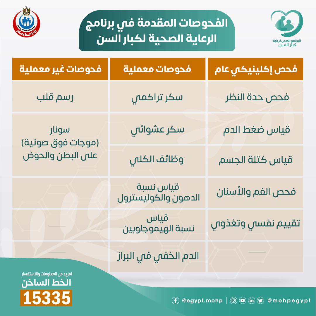 نشرت وزارة الصحة والسكان ، منشوراً توعوياً بـ الفحوصات طبية يتم عملها بالمجان في برنامج الرعاية الصحية لكبار السن.