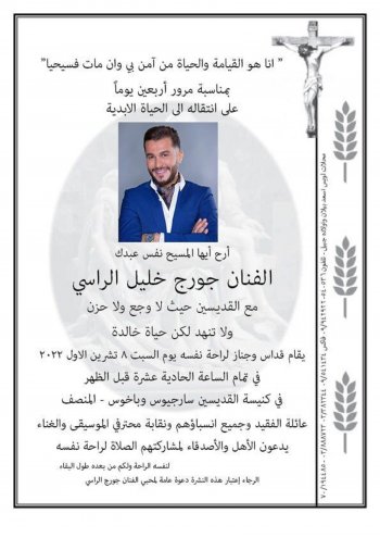 وتدعوة أسرة جورج الراسى ونقابة محترفى الموسيقى والغناء جميع محبى جورج الراسى من نجوم وغيرهم من المقربين له للصلاة لراحة نفسه.