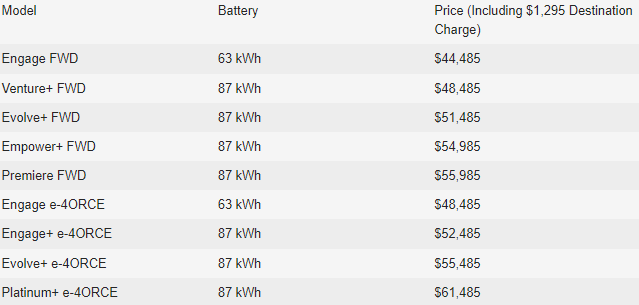 يسرد الجدول أدناه طراز 2023 Ariya حسب مستوى التجهيز وسعة البطارية في مقابل السعر :