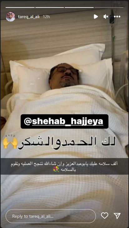 كما علق طارق العلى على صورة شهاب حاجية قائلا : “الف سلامة عليك يا أبو عبد العزيز وان شاء الله تنجح العملية وتقوم بالسلامة”.