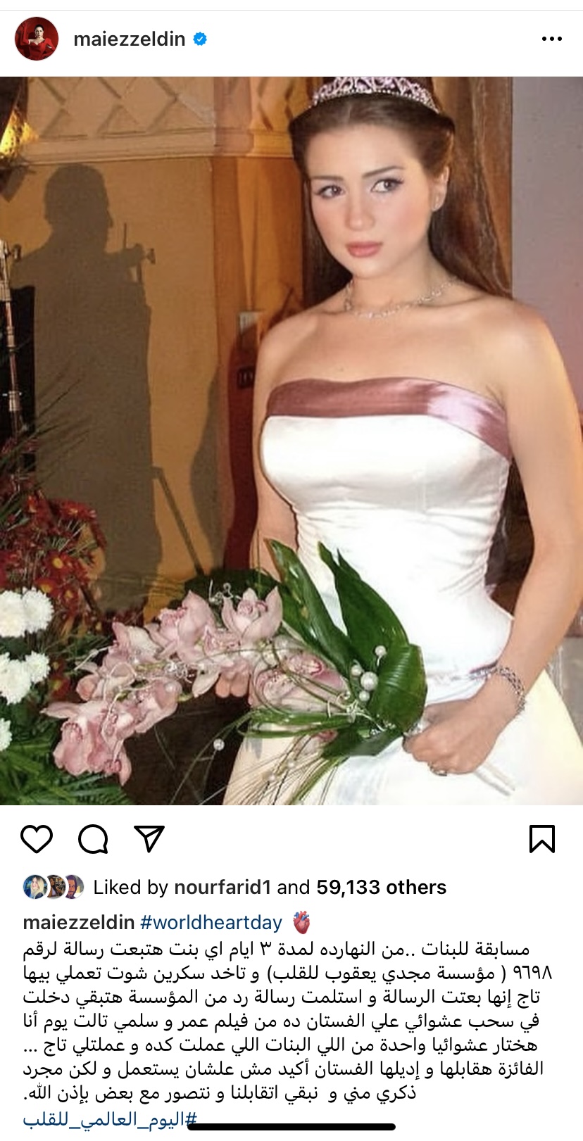 كتبت الفنانة مى عز الدين عبر حسابها بتطبيق “إنستجرام”: "مسابقة للبنات.. من النهارده لمدة 3 أيام أي بنت هتبعت رسالة لرقم ٩٦٩٨ ( مؤسسة مجدي يعقوب للقلب) وتاخد سکرین شوت تعملي بيها تاج إنها بعتت الرسالة واستلمت رسالة رد من المؤسسة، هتبقى دخلت في سحب عشوائي على الفستان ده من فيلم عمر وسلمى".