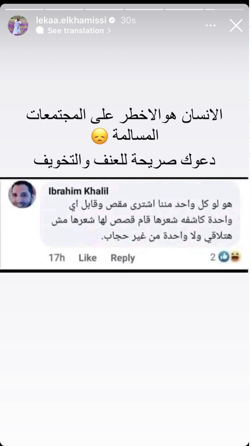 و جاء رد لقاء الخميسي: “الإنسان هو الأخطر علي المجتمعات المسالمة، دعواك صريحة للعنف والتخويف”.