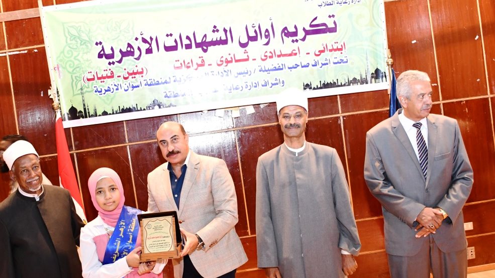 وقام اللواء أشرف عطية محافظ أسوان بتكريم أوائل الشهادات الأزهرية ، وأيضاً أوائل المسابقات الإجتماعية وذلك بحضور الشيخ أحمد السيد هاشم رئيس الإدارة المركزية لمنطقة أسوان الأزهرية ، والشيخ محمد عبد العزيز نائب مجلس الأباء والمعلمين ، وأيضاً محمود أحمد مدير عام المواد الثقافية ورعاية الطلاب، بجانب القيادات الدينية والتنفيذية ، وكذا أسر وأولياء أمور الطلاب والطالبات.