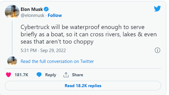 كتب الرئيس التنفيذي لـ "تسلا"، إيلون ماسك عبر تغريدة له في موقع التدوينات القصيرة "تويتر" تفاصيل جديدة حول شاحنة Cybertruck. كاشفًا أنها ستكون "مقاومة للماء بدرجة كافية" لتعمل "لفترة وجيزة" مثل القارب.