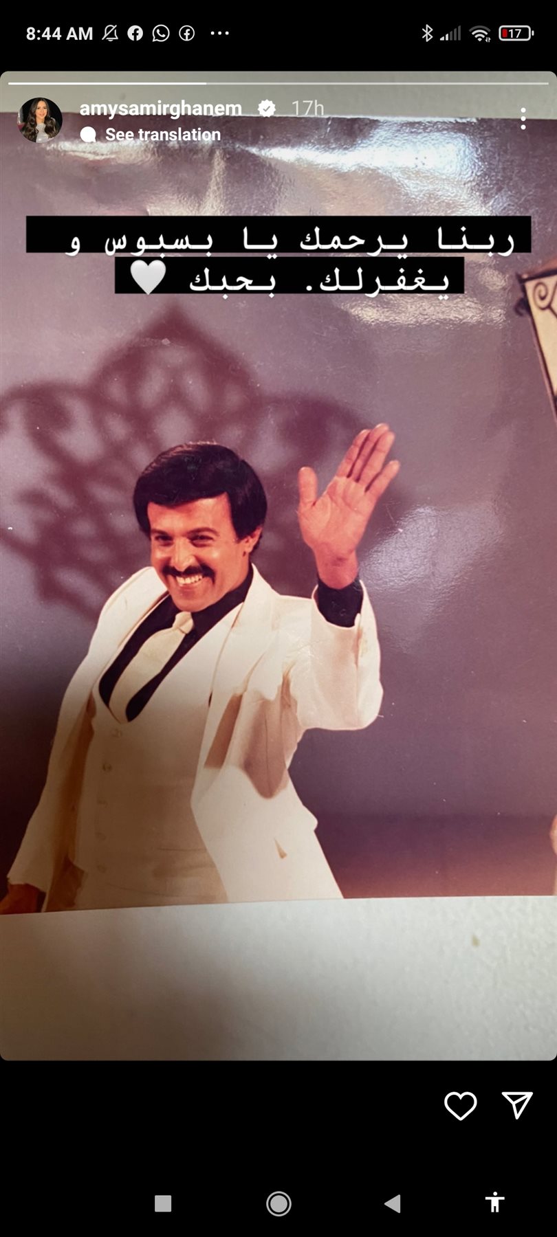 وظهر في الصورة والدها الراحل الفنان سمير غانم وعلقت عليها قائلة: " ربنا يرحمك يا بسبوس و يغفر لك .. بحبك".