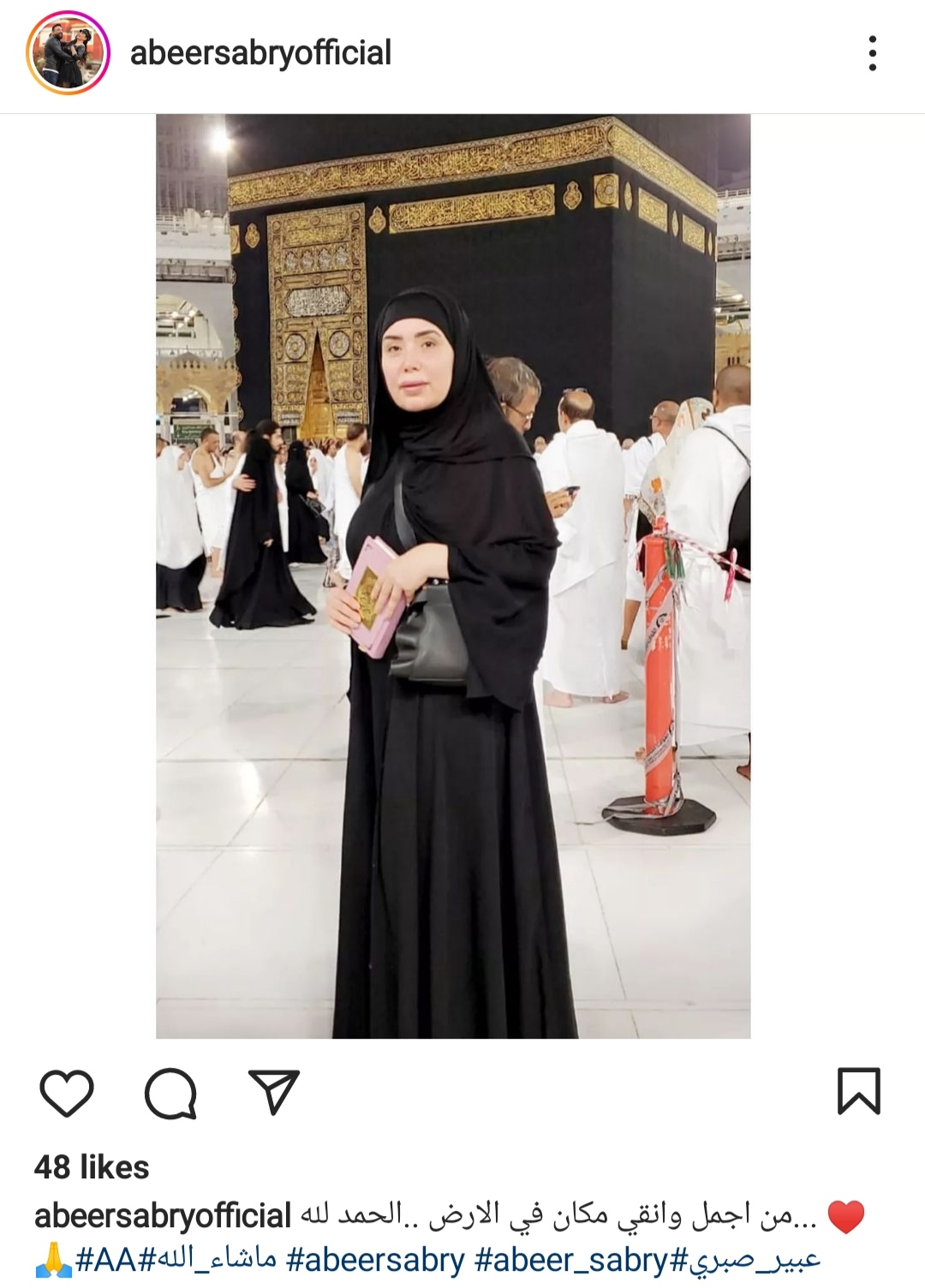 وظهرت عبير صبري في الصورة من الحرم المكي، وعلقت قائلة:" من أجمل وأنقى مكان في الأرض".