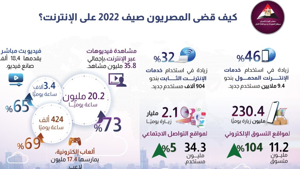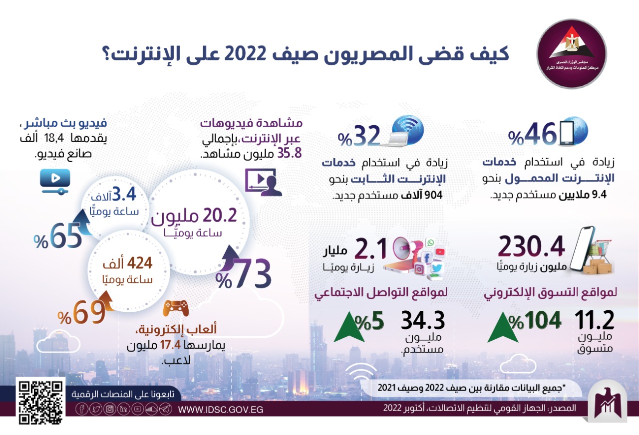نشر مركز المعلومات ودعم اتخاذ القرار بمجلس الوزراء إنفوجرافا جديدًا، يرصد خلاله تطور سلوكيات المصريين على الإنترنت وكيفية قضاء أوقاتهم، وفق بيانات الجهاز القومي لتنظيم الاتصالات في أكتوبر 2022، حول مؤشرات استخدام تطبيقات الإنترنت خلال 24 ساعة في صيف 2022، ومقارنتها بالفترة نفسها من صيف 2021.