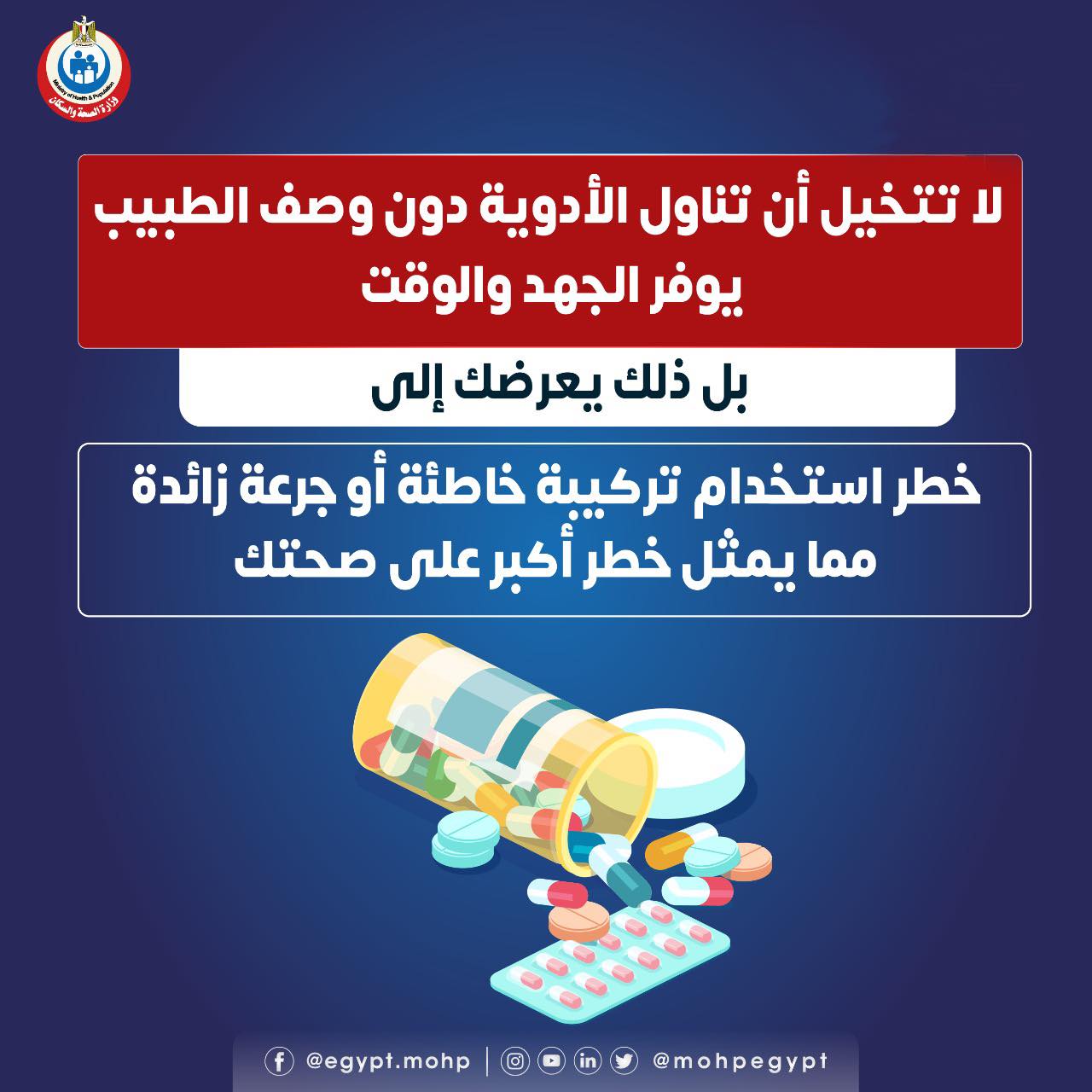 أكدت وزارة الصحة والسكان ، أنه لم يمكن أن نتصور أن تناول الأدوية دون وصف الطبيب يوفر الجهد والوقت، بل ذلك يعرضك لخطر استخدام تركيبة خاطئة أو جرعة زائدة مما يؤثر على صحتك.