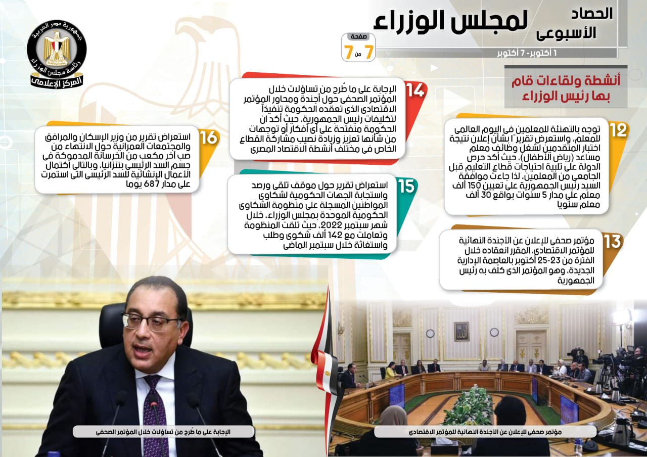 نشر المركز الإعلامي لمجلس الوزراء، تقريراً شمل إنفوجرافات سلط من خلالها الضوء على الحصاد الأسبوعي لمجلس الوزراء، وذلك خلال الفترة من 1حتى 7 أكتوبر 2022، والذي تضمن الموافقة على عدد من القرارات، فضلاً عن الاجتماعات واللقاءات التي عقدها الدكتور مصطفى مدبولي، رئيس مجلس الوزراء، بالإضافة إلى ما قام به من أنشطة.