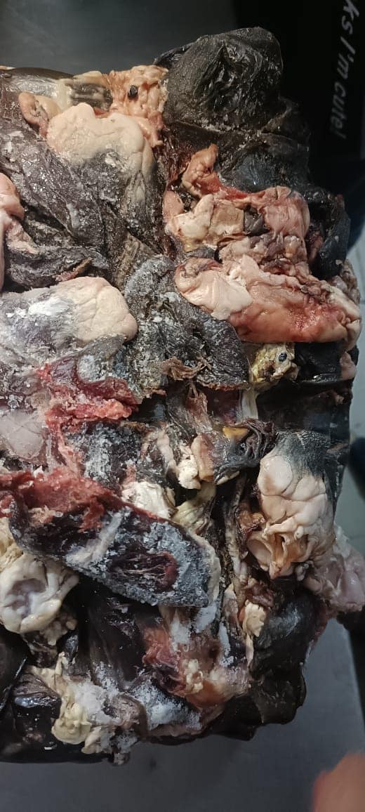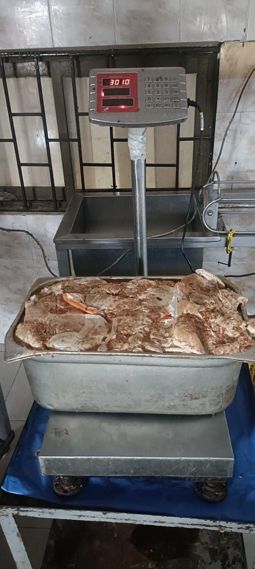 وخلال الحملة تم ضبط ٤ وربع طن لحوم ودواجن ومصنعات فاسَدة ومنتهية الصلاحية وغير صالحة للاستهلاك الآدمي بمخزن (مفرمة) داخل مزرعة بطريق السويس معدة للتصنيع والتجهيز بسلسلة مطاعم شهيرة.