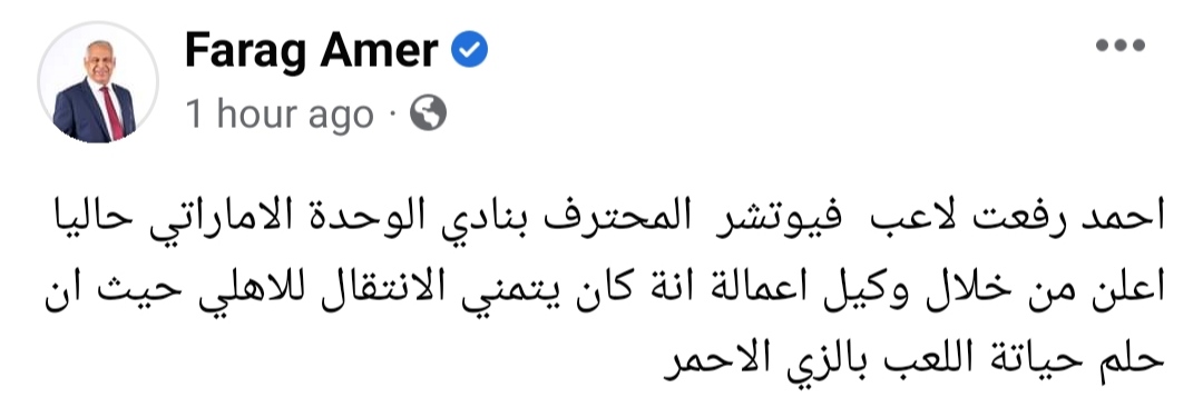 وكتب فرج عامر: "أحمد رفعت لاعب فيوتشر المحترف بنادي الوحدة الإماراتي حاليا أعلن من خلال وكيل اعمالة انه كان يتمني الانتقال للأهلي حيث ان حلم حياته اللعب بالزي الأحمر".