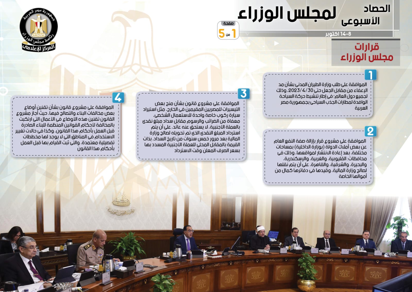 جاء في التقرير أنه تم إصدار عدد من القرارات، تشمل الموافقة على طلب وزارة الطيران المدني بشأن مد الإعفاء من مقابل الجعل حتى 30/4/2023، وذلك لجميع دول العالم؛ فى إطار تنشيط حركة السياحة الوافدة لمطارات الجذب السياحي بجمهورية مصر العربية، فضلاً عن الموافقة على مشروع قرار بإزالة صفة النفع العام عن بعض أملاك الدولة (بوزارة الداخلية) بمساحات مختلفة، بعد إعادة الانتشار لمواقعها، وذلك فى محافظات: القليوبية، والغربية، والإسكندرية، والبحيرة، والشرقية، والقاهرة، على أن يتم نقلها لصالح وزارة المالية، وقيدها في دفاترها كمال من أموالها الخاصة، بالإضافة إلى الموافقة على مشروع قانون بشأن منح بعض التيسيرات للمصريين المقيمين في الخارج، مثل استيراد سيارة ركوب خاصة واحدة للاستعمال الشخصي، معفاة من الضرائب والرسوم مقابل سداد مبلغ نقدي بالعملة الأجنبية، لا يستحق عنه عائد، على أن يتم استرداد المبلغ النقدي الذي تم تحويله لصالح وزارة المالية بعد مرور خمس سنوات من تاريخ السداد، بذات القيمة بالمقابل المحلي للعملة الأجنبية المسدد بها بسعر الصرف المعلن وقت الاسترداد.