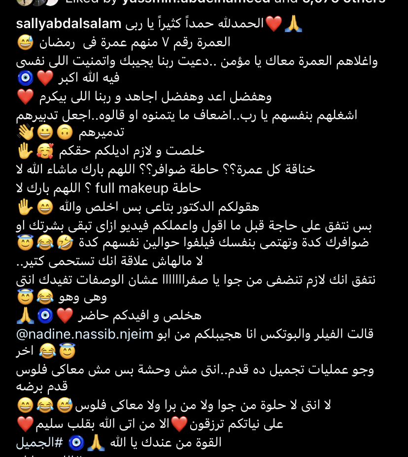 وردت الإعلامية سالي عبد السلام، على منتقدي ظهورها بمكياج و طلاء أظافر فى العمرة قائلة: "انضفي يا صفرا ده الدكتور بتاعى من غير عمليات تجميل".