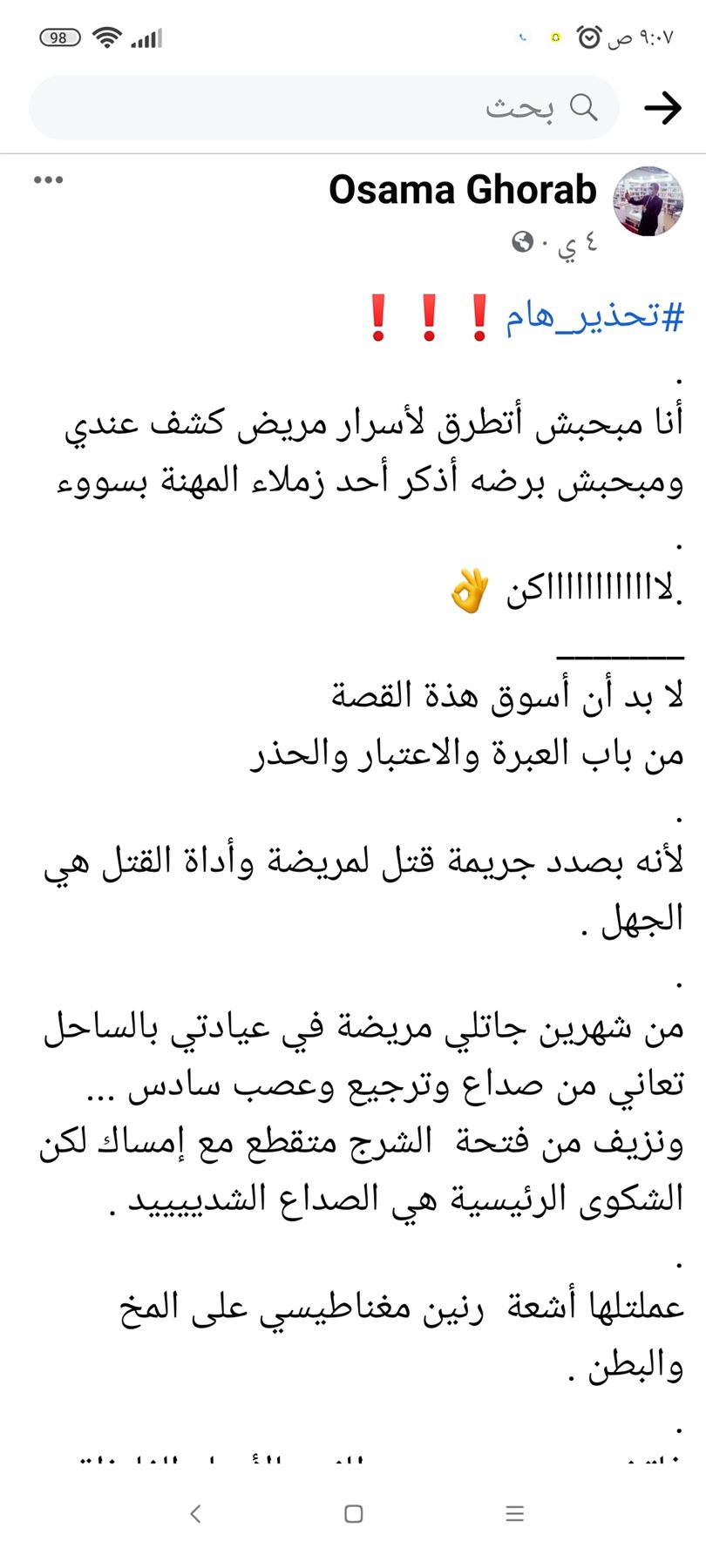 وقال الطبيب في منشوره "أنا مبحبش أتطرق لأسرار مريض كشف عنديومبحبش برضه أذكر أحد زملاء المهنة بسوء لكن لا بد أن أسوق هذه القصةمن باب العبرة والاعتبار والحذر لأنه بصدد جريمة قتل لمريضة وأداة القتل هي الجهل.