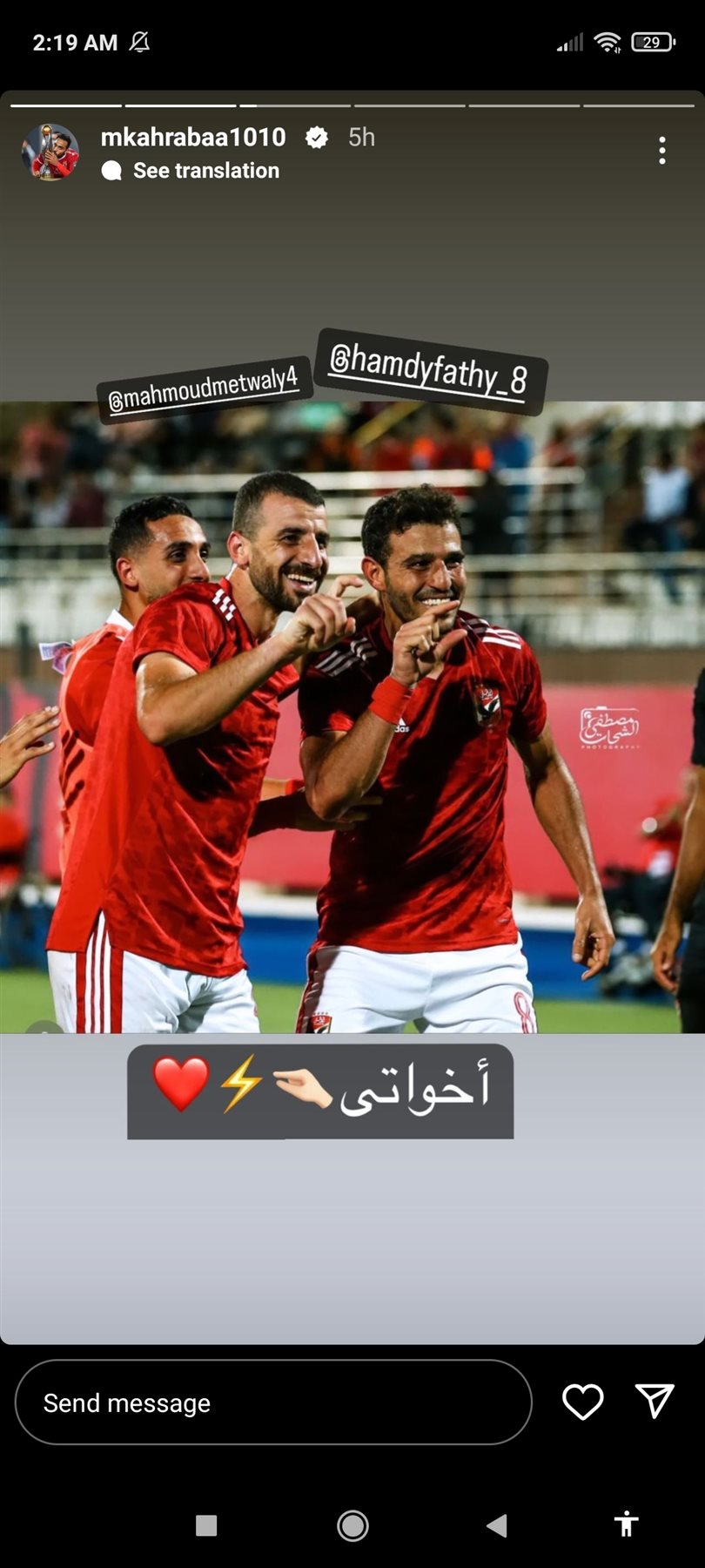 وظهر في الصورة اللاعبان حمدى فتحى ومحمود متولى وهما يحتفلا بالفوز على طريقة كهربا، وعلق قائلا: "إخواتى".
