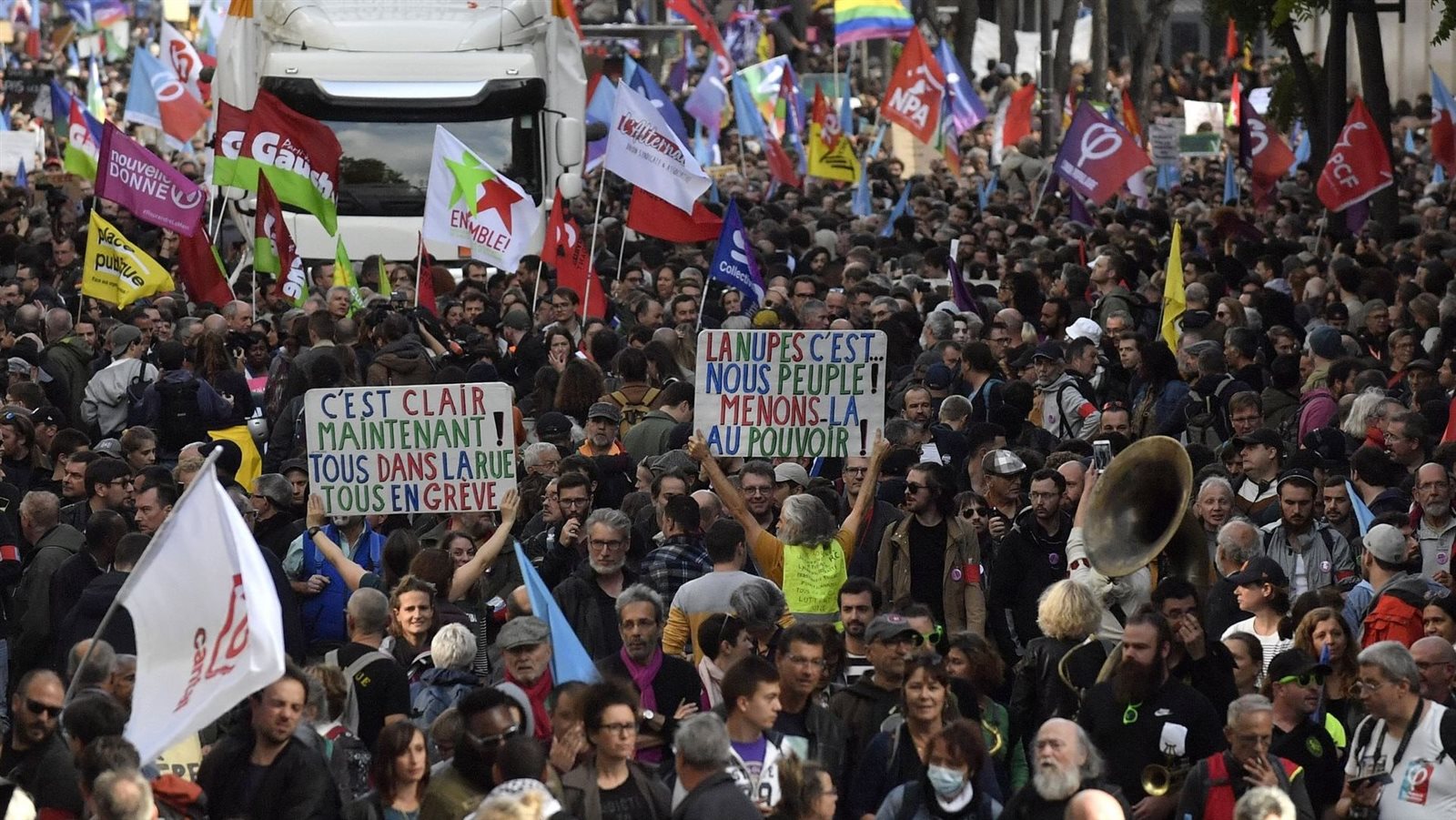 وشارك آلاف المتظاهرين في مسيرة ضخمة بفرنسا، الأحد، بدعوة من تيار اليسار، احتجاجا على أزمة غلاء المعيشة ونقص الوقود الذي يشل الحركة منذ أسابيع، حيث يتواصل الإضراب الذي يمنع توزيع الوقود في البلاد.