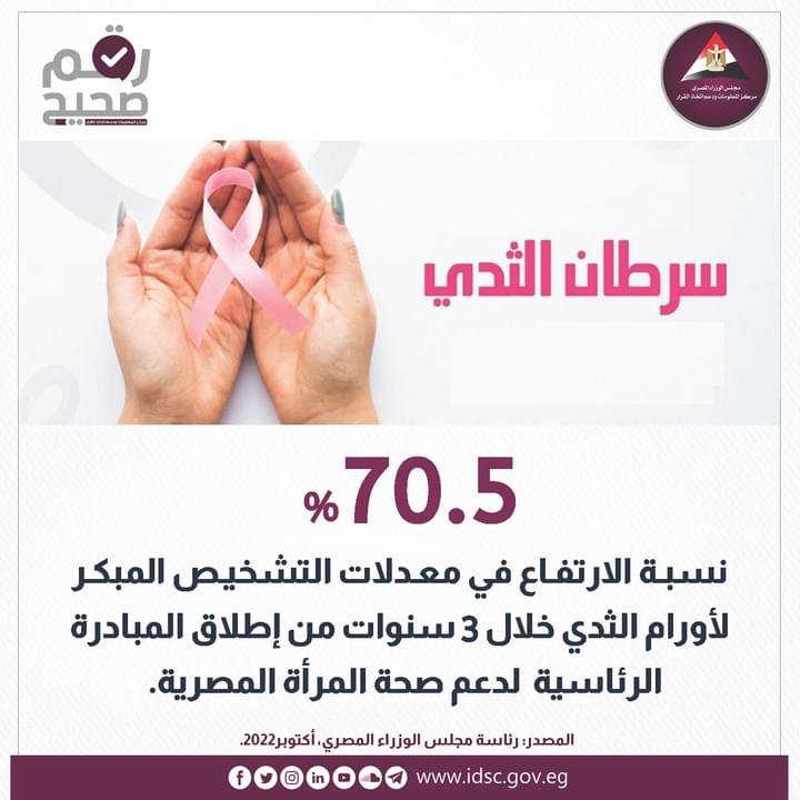 وأعلنت وزارة الصحة والسكان عن انخفاض نسبة اكتشاف أورام الثدي في مراحلها المتأخرة (الثالثة والرابعة) من 58.5% من الحالات إلى 29.5%، وذلك نتيجة للفحص والتشخيص المبكر، كما ارتفعت نسبة اكتشاف الإصابة بالأورام في المراحل المبكرة إلى 70.5 %.