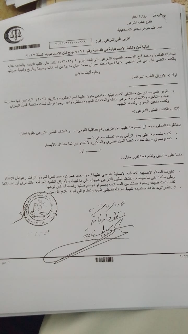 وأكد التقرير إصابة مها محمد المعروفة بعروس الإسماعيلية، بكدمة متسحجة أعلي يسار الرأس بأبعاد نصف سم في ١ سم، بالإضافة إلي إصابتها بتجمع دموي بسيط تحت ملحمة العين اليسرى، ونفى التقرير أن تشكو المجني عليها من أي مشاكل بالإبصار.