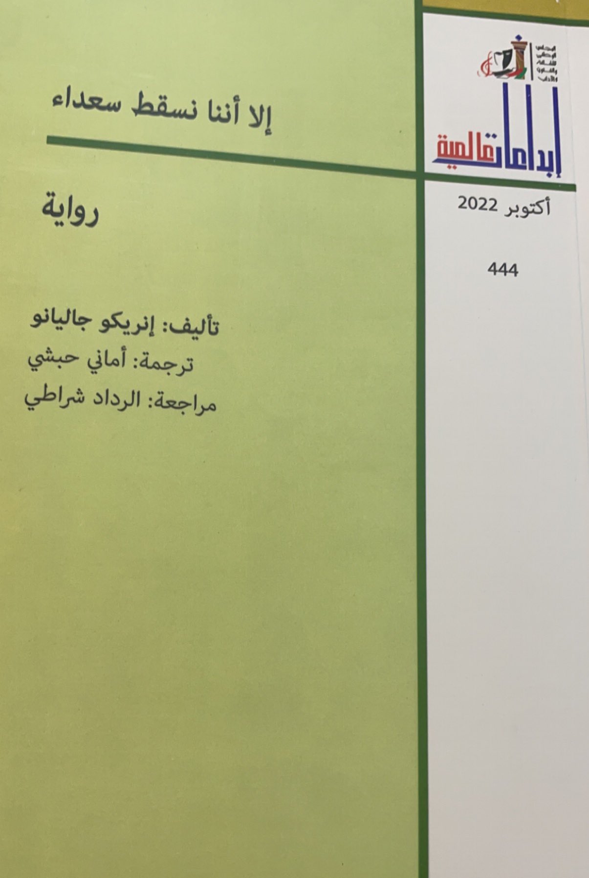 صدرت ترجمة رواية "إلا أننا نسقط سعداء" للكاتب الإيطالي إنريكو جاليانو، ضمن سلسلة "إبداعات عالمية" التي يصدرها المجلس الوطني للثقافة والفنون والآداب بالكويت، وقامت بترجمتها إلى اللغة العربية المترجمة المصرية أماني حبشي، وراجع الترجمة الرداد شراطي.