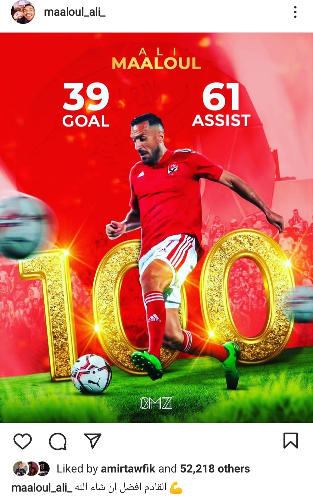 وذكر علي معلول إحصائياته الأخيرة التى قدرت بـ ٣٩ هدفا و ٦١ اسيست، وعلق معلول: "القادم أفضل باذن الله".