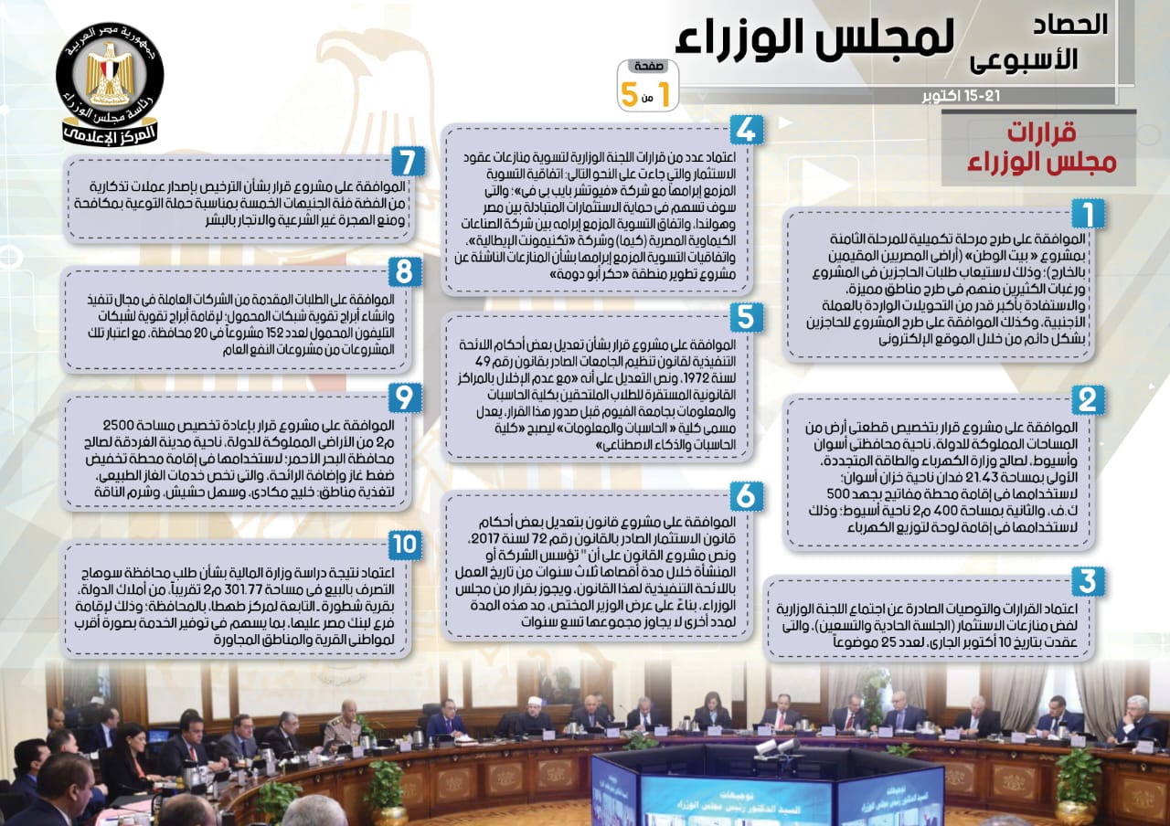 وجاء في التقرير أنه تم إصدار عدد من القرارات، تشمل اعتماد عدد من قرارات اللجنة الوزارية لتسوية منازعات عقود الاستثمار والتي جاءت على النحو التالى: اتفاقية التسوية المزمع إبرامها مع شركة "فيوتشر بايب بى فى"؛ والتي سوف تسهم في حماية الاستثمارات المتبادلة بين مصر وهولندا، واتفاق التسوية المزمع إبرامه بين شركة الصناعات الكيماوية المصرية (كيما) وشركة "تكنيمونت الإيطالية"، واتفاقيات التسوية المزمع إبرامها بشأن المنازعات الناشئة عن مشروع تطوير منطقة "حكر أبو دومة"، بالإضافة إلى الموافقة على طرح مرحلة تكميلية للمرحلة الثامنة بمشروع " بيت الوطن" (أراضي المصريين المقيمين بالخارج)؛ وذلك لاستيعاب طلبات الحاجزين في المشروع ورغبات الكثيرين منهم في طرح مناطق مميزة، والاستفادة بأكبر قدر من التحويلات الواردة بالعملة الأجنبية، وكذلك الموافقة على طرح المشروع للحاجزين بشكل دائم من خلال الموقع الإلكتروني، فضلاً عن الموافقة على مشروع قرار بشأن تعديل بعض أحكام اللائحة التنفيذية لقانون تنظيم الجامعات الصادر بقانون رقم 49 لسنة 1972، ونص التعديل على أنه "مع عدم الإخلال بالمراكز القانونية المستقرة للطلاب الملتحقين بكلية الحاسبات والمعلومات بجامعة الفيوم قبل صدور هذا القرار، يُعدل مسمى كلية " الحاسبات والمعلومات" ليصبح "كلية الحاسبات والذكاء الاصطناعى"، إلى جانب الموافقة على مشروع قرار بشأن الترخيص بإصدار عملات تذكارية من الفضة فئة الجنيهات الخمسة بمناسبة حملة التوعية بمكافحة ومنع الهجرة غير الشرعية والاتجار بالبشر، كما تمت الموافقة على الطلبات المقدمة من الشركات العاملة في مجال تنفيذ وانشاء أبراج تقوية شبكات المحمول؛ لإقامة أبراج تقوية لشبكات التليفون المحمول لعدد 152 مشروعاً في 20 محافظة، مع اعتبار تلك المشروعات من مشروعات النفع العام.