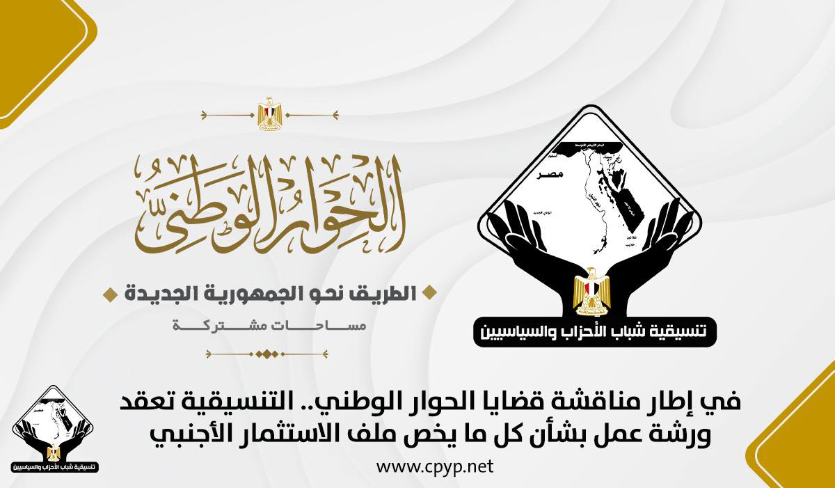 في إطار اهتمام تنسيقية شباب الأحزاب والسياسيين وسعيها الدائم لمناقشة أهم القضايا التي تشغل الشارع المصري بين المتخصصين وأعضاء التنسيقية تعقد تنسيقية شباب الأحزاب والسياسيين ورشة عمل لبحث ملف الاستثمار الأجنبي في إطار القضايا التي سيتم طرحها ومناقشتها خلال جلسات الحوار الوطني المختلفة والتي ستنطلق خلال الفترة المقبلة وذلك غدا السبت الساعة الثانية ظهرا بمقر التنسيقية.