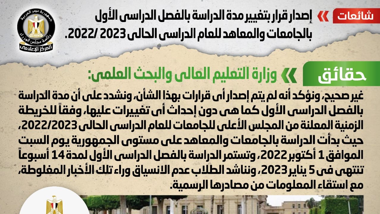 نفي المركز الإعلامي لمجلس الوزراء ما تداولت بعض المواقع الإلكترونية وصفحات التواصل الاجتماعي أنباء بشأن إصدار قرار بتغيير مدة الدراسة بالفصل الدراسي الأول بالجامعات والمعاهد للعام الدراسي الحالي 2022 /2023، وقد قام المركز الإعلامي لمجلس الوزراء بالتواصل مع وزارة التعليم العالي والبحث العلمي، والتي نفت تلك الأنباء، مُؤكدةً أنه لا صحة لتغيير مدة الدراسة بالفصل الدراسي الأول بالجامعات والمعاهد للعام الدراسي الحالي 2022/2023، وأنه لم يتم إصدار أي قرارات بهذا الشأن، مشددةً على أن مدة الدراسة بالفصل الدراسي الأول كما هي دون إحداث أي تغييرات عليها، وفقاً للخريطة الزمنية المعلنة من المجلس الأعلى للجامعات للعام الدراسي الحالي 2022/2023، حيث بدأت الدراسة بالجامعات والمعاهد على مستوى الجمهورية يوم السبت الموافق 1 أكتوبر 2022، وتستمر الدراسة بالفصل الدراسي الأول لمدة 14 أسبوعاً تنتهي في 5 يناير 2023، مناشدةً الطلاب عدم الانسياق وراء تلك الأخبار المغلوطة، مع استقاء المعلومات من مصادرها الرسمية.