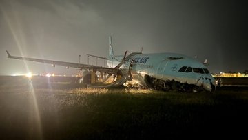 ظلت طائرة تابعة للخطوط الجوية الكورية عالقة في العشب في مطار فلبيني اليوم، الاثنين، بعد أن خرجت عن المدرج لدى هبوطها في مطار سيبو الدولي في الفيلبين، في أعقاب طقس ممطر في الليلة السابقة.