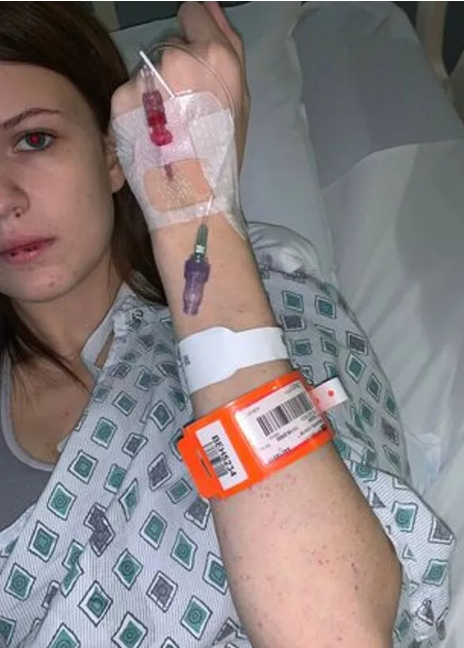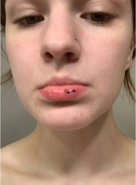 تجاهلتهم في البداية ، لكنها قالت إنه في غضون 15 دقيقة ساءت صحتها بسرعة حيث ظهرت كدمات وعانت من نزيف في الأنف لا يتوقف. كما ظهرت قشرة على شفتها السفلية.