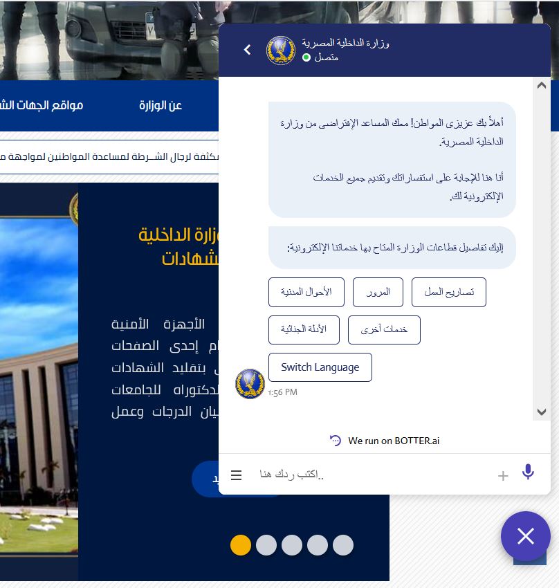 أطلقت وزارة الداخلية خدمة جديدة للرد الآلى اللحظى على استفسارات المواطنين بشأن الخدمات الإلكترونية التى تقدمها قطاعات وزارة الداخلية باستخدام تقنيات الذكاء الإصطناعى (Chatbot) على بوابة وزارة الداخلية الرسمية على شبكة المعلومات الدولية "الإنترنت" .
