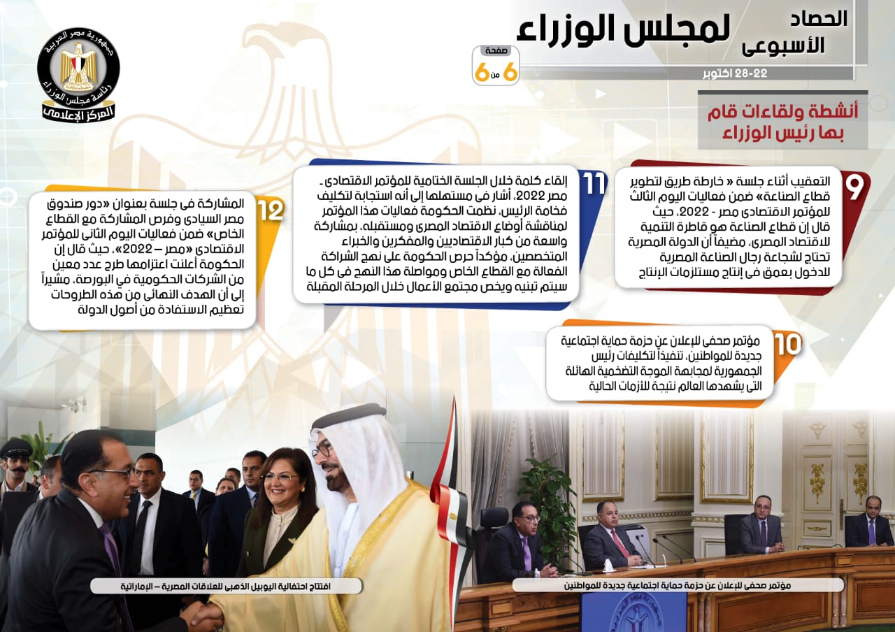 واستكمالاً لأنشطة رئيس مجلس الوزراء على مدار الأسبوع، أظهر التقرير إلقاء كلمة خلال الجلسة الختامية للمؤتمر الاقتصادي ـ مصر 2022، أشار في مستهلها إلى أنه استجابة لتكليف الرئيس، نظمت الحكومة فعاليات هذا المؤتمر لمناقشة أوضاع الاقتصاد المصري ومستقبله، بمشاركة واسعة من كبار الاقتصاديين والمفكرين والخبراء المتخصصين، مؤكداً حرص الحكومة على نهج الشراكة الفعالة مع القطاع الخاص ومواصلة هذا النهج في كل ما سيتم تبنيه ويخص مجتمع الأعمال خلال المرحلة المقبلة، كما شهد افتتاح احتفالية اليوبيل الذهبى للعلاقات المصرية – الإماراتية "٥٠ عاماً.. مصر والإمارات قلب واحد"، التي تنعقد تحت رعاية رئيس الجمهورية؛ بمناسبة مرور ٥٠ عاماً على انطلاق العلاقات الدبلوماسية والأخوية بين مصر، والإمارات.