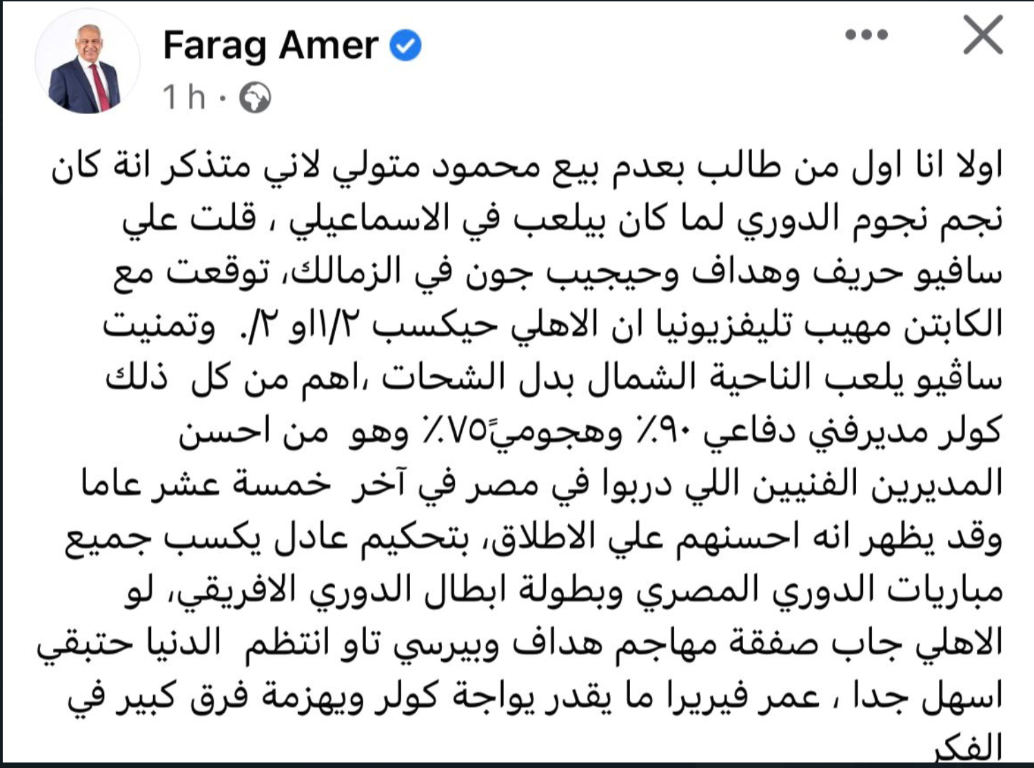 و كتب فرج عامر : أولا انا أول من طالب بعدم بيع محمود متولي لاني متذكر انه كان نجم نجوم الدوري لما كان بيلعب في الإسماعيلي ، قلت علي سافيو حريف وهداف وحيجيب جون في الزمالك، توقعت مع الكابتن مهيب تليفزيونيا ان الأهلي حيكسب ١/٢او ٢/. وتمنيت ساڤيو يلعب الناحية الشمال بدل الشحات .