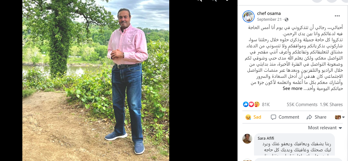 لكن قبل رحيل الشيف أسامة السيد المفاجئ اليوم، والذي أعلنته الصفحة الرسمية الخاصة به على موقع “فيسبوك”، كان قد اختفى من الظهور عبر مقاطع الفيديو التي كان ينشرها عبر حسابه، مكتفيا بنشر صور الوصفات وطرق الإعداد فقط.