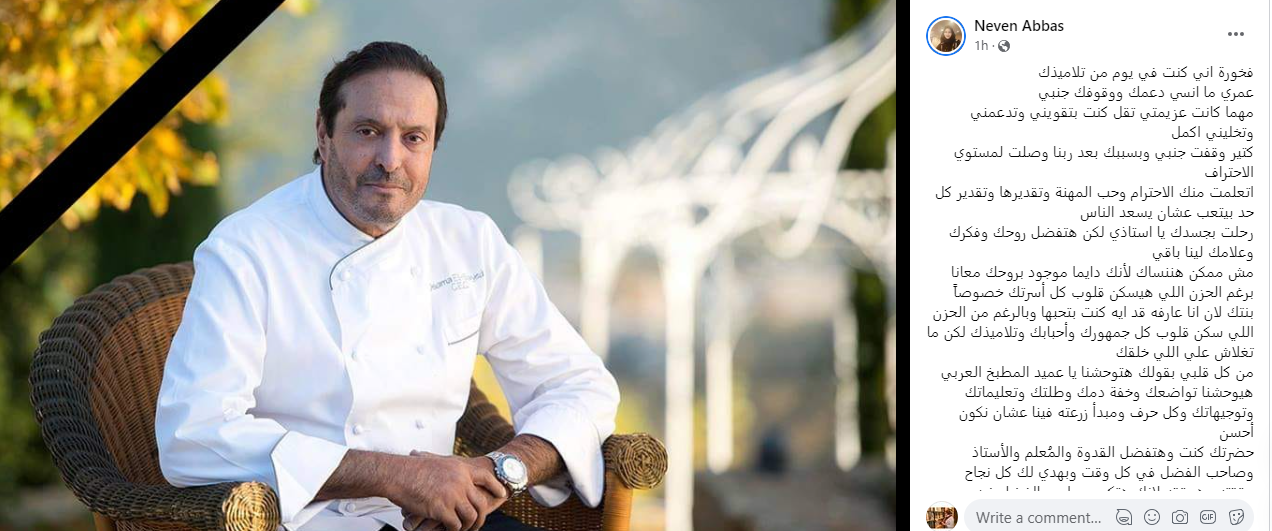 وتابعت: "برغم الحزن اللي هيسكن قلوب كل أسرتك، خصوصاً بنتك، لأن أنا عارفة قد إيه كنت بتحبها، وبالرغم من الحزن اللي سكن قلوب كل جمهورك وأحبابك وتلاميذك، لكن ما تغلاش على اللي خلقك،من كل قلبي بقولك هتوحشنا يا عميد المطبخ العربي، هيوحشنا تواضعك وخفة دمك وطلتك وتعليماتك وتوجيهاتك وكل حرف ومبدأ زرعته فينا عشان نكون أحسن، حضرتك كنت وهتفضل القدوة والمُعلم والأستاذ وصاحب الفضل في كل وقت، وبهدي لك كل نجاح حققته وهحققه لأنك هتكون صاحب الفضل فيه".