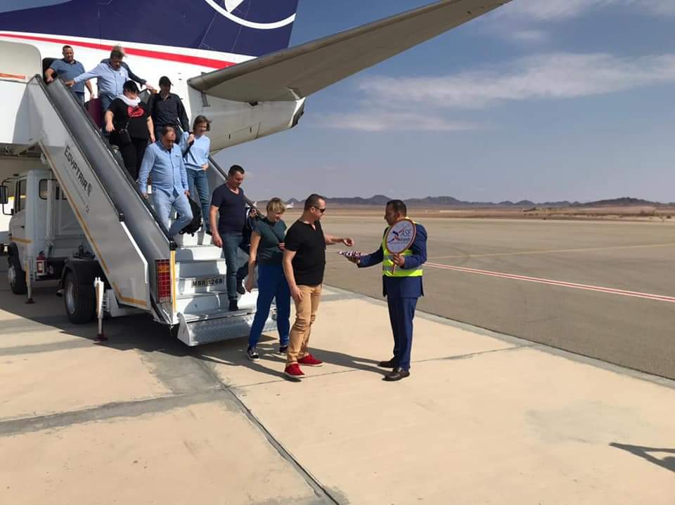 و استقبل المطار أول رحلة بالجسر المائى فور هبوط الطائرة تعبيرا عن الترحيب بعودة رحلات الشركة البولندية مرة أخرى وقام فريق العلاقات العامة فى مطار طابا بالترحيب بالسائحين وتيسير إجراءات وصولهم .