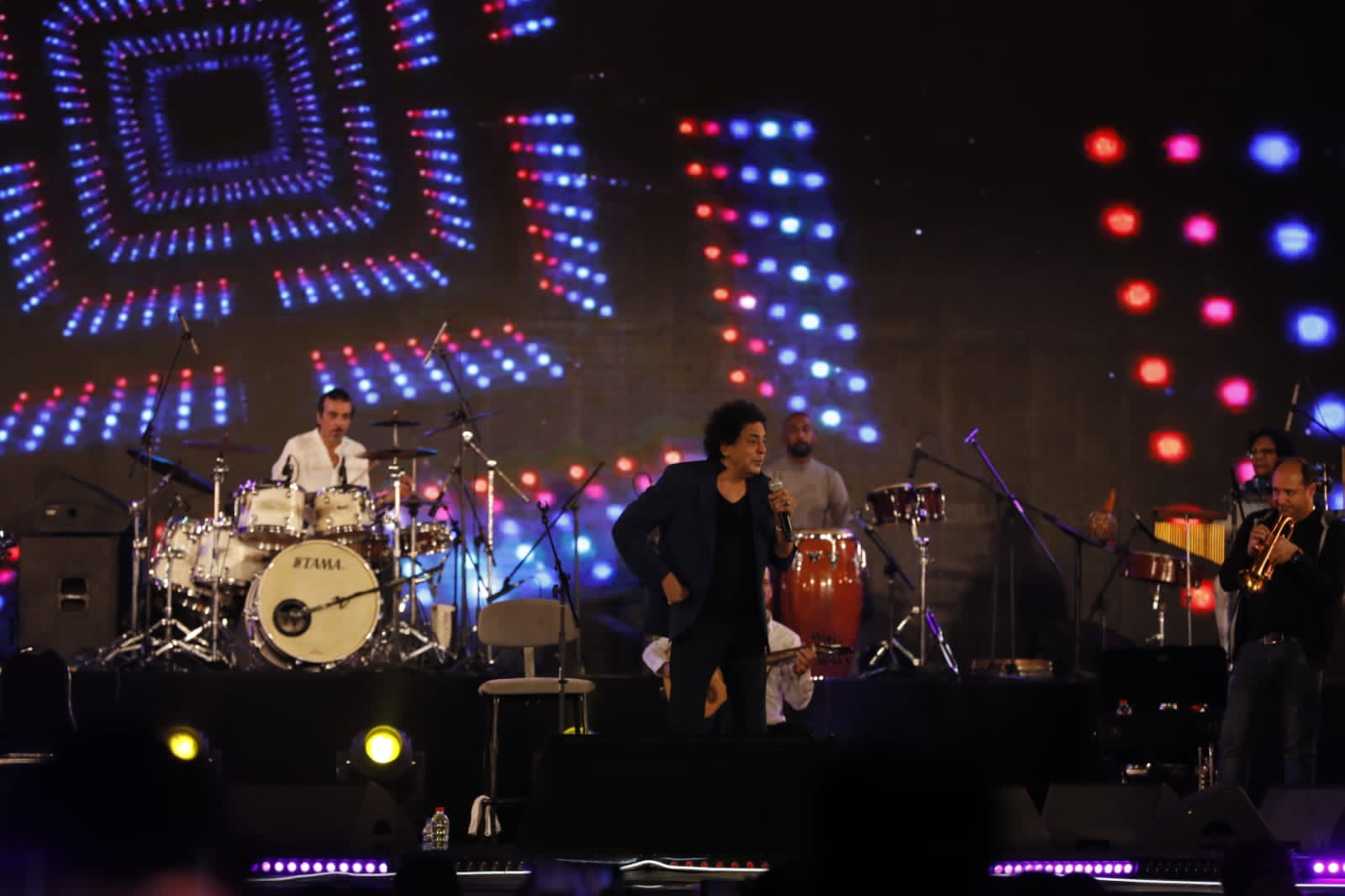 ووسط الحفل، حرص منير على أن يوجه كلمة لجمهوره، وقال: "اعذروني لجلوسي ووقوفي"، ولكن الجمهور لم يتركه يكمل حديثه، وهتفوا له: بنحبك يا منير.